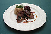 Zraz po staropolsku ze śliwką podany z kaszą jęczmienną.