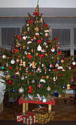 Sztuczna choinka, 170cm. Ubierana "na bogato" i pstrokato. Dziewczyny obwieszają ją bomkami, slomianymi ozdobami, kokardami z sizalu, pierniczkami, lańcuchami, lapkami, czym tylko zechcą. Ja jedynie zgrzytam zębami. :) W domu ubiorę sobie elegancko malą, też sztuczną ale tam gdzie święta-na wsi niech robią co chcą. Koty nie pozwalają na żywą choinkę, wieszają się na niej, zresztą nie cierpię klujących igiel. Żywą ustroimy w ogrodzie, skoro już tam rośnie jakiś iglak.