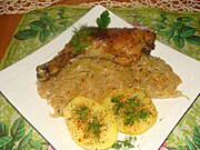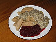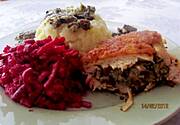 Wczoraj na obiad robiłam pierś nadzianą farszem z grzybów leśnych, ziemniaki z wody i sałatka z buraczków wg. przepisu przywiezionego przez kuzynkę z Białorusi.