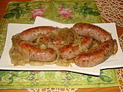 Kiełbasa biała pieczona, ziemniaki, ćwikła z chrzanem.