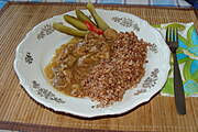 Dziś był sos mięsno-pieczarkowy, dla mnie i synka kluski śląskie, dla męża kasza gryczana, i moja surówka z kapusty kiszonej http://wielkiezarcie.com/recipe66284.html