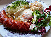 Ziemniaki z koprem, kiełbasa smażona na jeża z duszoną cebulą, jajko sadzone, surówka z kapusty pekińskiej z majonezem i zestaw sałat w sosie ziołowym.