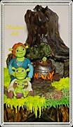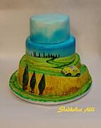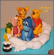 Pewnie myślałaś o Przytulaczkach. Tort razem z podkładką pokryłam białą masą cukrową, później malowałam aerografem boki na zielono, zostawiając miejsce na ścieżkę. Później ścieżkę na żółto. Poprawiłam też pędzlem aby sprawiała wrażenie nierówności. Boki tortu. np. w Puchatku malowałam pudrowymi barwnikami rozpuszczonymi w spirytusie.