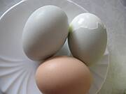 Jaja od kur zielononóżek (0) mają barwę kremową, są podłużne i znacznie mniejsze od mutantów z marketów. Zawierają tyle samo cholesterolu co 1,2,3, ale mają mniej białka.