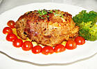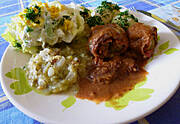 Zrazy z karkówki z szynką i ogórkiem, ziemniaki z koprem,