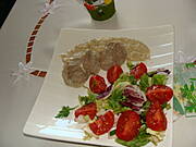 Filet z kurczaka z gałązkami pietruszki i plasterkami czosnku zawinięty w szynkę dojrzewającą-usmażony na maśle,ziemniaczki młode z koperkiem,surówka z nowalijek z serem feta i oliwkami,do pcia kompot z truskawek:)