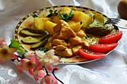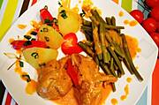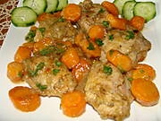 polędwiczki z kurczaka marynowane po tajsku, potem grilowane i podane z dipem słodko - kwaśno - ostrym oraz młodymi marchewkami na parze..