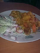 Pieczeń wieprzowa na ostro. Do tego frytki i mizeria.
