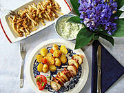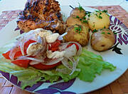 Filety udek kurczaczych z grilla + sos czoskowo koperkowy + pomidorki z cebulką + bułeczki opiekane na grilu.