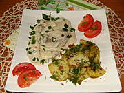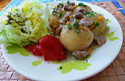 Ziemniaki, bitki w sosie i sałata z vinegretem.