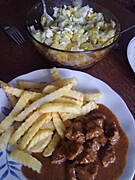 Gulasz wołowy z udźca, z frytkami i surówką z młodej kapusty pekińskiej