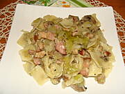 Młoda kapusta duszona z koperkiem,boczkiem wędzonym i mortadelą podsmażoną,coś jak bigosik do tego ziemniaki.