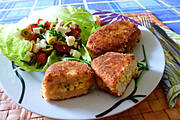Zupa owocowa z czerwonej porzeczki z makaronem ,kotleciki z gotowanych kalafiorów z nadzieniem jajeczno - szczypiorkowym, sałatka grecka.