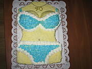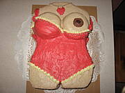 Taki tort robiłam bratu na 30 urodziny i sąsiadki synowi na 18-stkę. Biszkopt upieczony wyprofilowałam, przekroiłam i nasączyłam każdy placek (było 4 warstwy). Każdą warstwę posmarowałam dżemem z czarnej porzeczki i bitą śmietaną. wierzch i boki tortu posmarowałam bitą śmietaną z dodatkiem kakao. Piersi zrobiłam z galaretki ( do dwóch salaterek rozrobiłam galaretki).Ułożyłam piersi na torciku i posmarowałam kakaową bitą śmietaną. Pępek zrobiłam z ziarenka kawy. Bikini zrobiłam z białaj i różowej bitaj śmietany (dodałam barwnika różowego i wyciskałam szprycą). Tort zachwycił wszystkich gości. Zyczę smacznego!!! A co do tortu dla męża- to też zrobiłabym, a co????????? Pozdrawiam