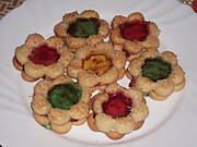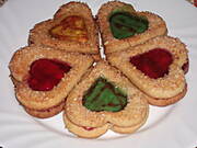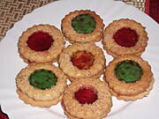 ciastka z dziurką zamoczyć w białku i kokosie.Piec na złoty kolor.Po upieczeniu przełożyć samą marmoladą lub jak ja robiłam,posmarować cieniutko marmoladą i wypełnić tężejącymi galaretkami.