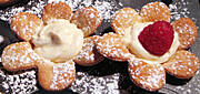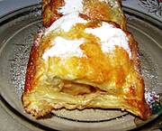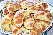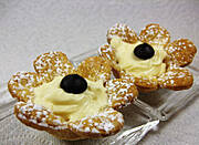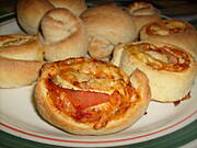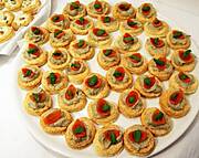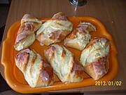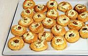 Zwykłe ciasto francuskie, wykrojone obręczą do pierogów i upieczone, posmarowane serkiem topionym ze szczypiorkiem i serek śmietankowy , wymieszany z ostrą papryką i mielonymi orzechami, z pomidorem i bazylią:)Taka przekąska wymyślona przez córkę:)