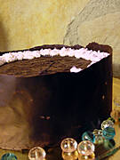 Owinięty jest pasem czekolady, który powstał przez rozsmarowanie czekolady na papierze i przyłożeniu do ciasta papierem na zewnątrz :) Dziękuję miło mi że się podoba :)