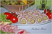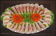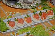 Śledź po japońsku, jajka z łososiem i majonezem,piramidki nadziewane sałatką jarzynową i jajkiem,koreczki z ogórkiem konserwowym i serkiem chrzanowym,ślimaczki z ciasta francuskiego z szynką,bułeczki z dodatkami,ser żółty z pieczarkami,roladki z szynki z serkiem,sałatka jarzynowa zegar,sałatka z kalafiora,drzewko owocowe,jajka nadziewane pszczółki. Jest tego trochę , może coś sobie wybierzesz. Pozdrawiam.