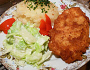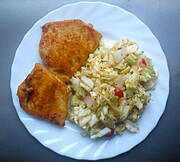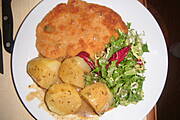 Kotlet drobiowy, ziemniaki, sos pieczeniowy (od niedzielnych udek), mieszanka sałat z winegretem.