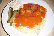 Pulpeciki wieprzowe w sosie pomidorowym, puree ziemniaczane z koperkiem, kiszony ogórek i surówka porowa.