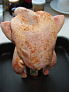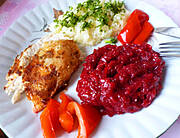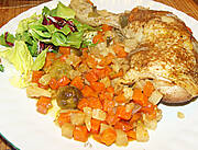 Kurczak duszony w sosie pomidorowo-sliwkowo-ziolowym i opcjonalnie ziemniaki lub makaron, surowka z marchewki, ananasa i rodzynek oraz piwko z sunquickiem.