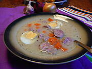 Żurek z dobieranymi ziemniaczkami polanymi podsmażoną kiełbaską z cebulką
