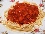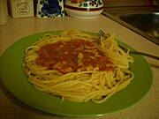 Podróba spagetti: makaron gotowany al dente + sos NAPOLI, do którego dodałam podsmażoną kiełbaskę, pieczarki, por, startą marchew, czosnek, cebulę i paprykę czerwoną oraz łyżeczkę chili w płynie, chyba zabrakło zieleninki :)