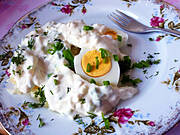 Twarożek z cebulką i dość dużą ilością śmietany (czy jogurtu- jak kto woli), musi być dość rzadki. Obok na talerzu gorące ziemniaki. Na łychę gorący kartofel, maczasz w zimnym twarogu i do paszczy. Mój mąz uwielbia, zawsze tak się nawpycha, że potem musi się ,,dżymnąć".