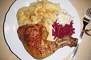 Wczoraj: rosół z makaronem, ziemniaki tłuczone a do nich udka pieczone, karkówka, schab ze śliwką plus kapusta kiszona z grzybami (na ciepło), buraczki, czerwona kapusta parzona.