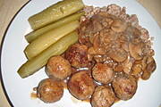 Pulpeciki wieprzowe w sosie pieczarkowym, kasza gryczana, ogórki kiszone.