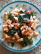 Makaron z suszonymi pomidorami, czosnkiem i szpinakiem.