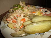 Dzisiaj ponownie leniwy obiad, ale z powodu sprzątania, które wczoraj odłożyłam na później ze względu na wyżej wymienioną książkę... Czyli ziemniaczki, potrawka z kurczaka, rosołowych warzyw i koperku, a do tego korniszonki:) [jak ten rosół niedzielny potrafi się człowiekowi przysłużyć] :)