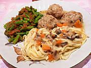 Dzisiaj na obiad makaron gniazdka, pulpeciki w sosie pieczarkowym z marchewką i zielona fasolka szparagowa z masłem i bułką tartą. Do picia herbata z cytryną i coca cola.