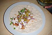 Tortilla z kurczakiem, mieszanką sałat, czerwoną cebulą, ogórkiem konserwowym i sosem czosnkowym.