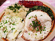 Jajka w sosie musztardowym,tłuczone ziemniaki,kiszona kapusta z czerwoną cebulką, kompot śliwkowy a dla dzieci zapiekanka na słodko-mix twarogu,śmietanki,ugotowanych płatków ryżowych,rodzynek....