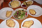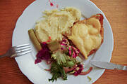 Sobota: Kotlet drobiowy zapiekany z morelami i żółtym serem, puree ziemniaczane z masłem i śmietanką, mieszanka sałat z winegretem, surówka koperkowa, ogórki konserwowe, ćwikła.