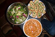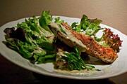 Grillowana pierś z kurczaka w curry, pieczone ziemniaczki z pieczarkami, mieszanka sałat z winegretem, sos z sera pleśniowego.