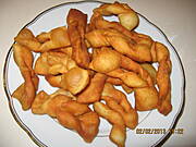 Urobiona kulke ciasta uderzacm z calej sily o blat stolu 20 razy. Dlaczego 20 x - nie wiem. Tak zapamietalam a rodzinnego domu. Nie schladzam ciasta w lodowce. B. cieniutko walkuje - i kroje paski nozem do pizzy. Wychodzi czubaty talerz delikatnych i mocno nadmuchanych - jak widac na foto ( tu jeszcze gorace - przed posypaniem pudrem ) troche krzywe.... ale dobre. Pozdrawiam !