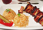 Zupa z suszonych borowików z kluseczkami, szaszłyk wieprzowy, ryż, surówka z pomidorów i sałaty, sok z czarnej porzeczki.