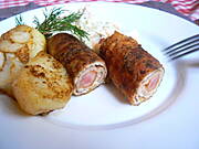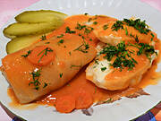 Rosol z makaronem, na drugie roladki z szynki w sosie wlasnym, ziemniaki i kapusta modra, do picia sok z pomaranczy.
