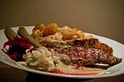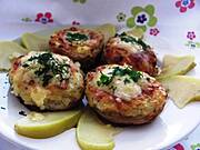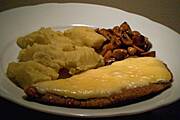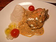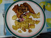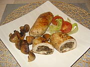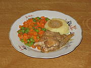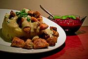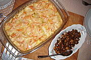 Ziemniaki puree ze szczypiorem zapiekane z filetem z kurczaka, morelami i żółtym serem, smażone pieczarki.