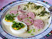 U nas dzisiaj na obiad ziemniaki tłuczone z koperkiem, barszcz biały z bialą kiełbasą i jajka na twardo ze szczypiorkiem. Do picia herbata z cytryną, sok z czarnej porzeczki i piwo bezalkoholowe Karmi dla mnie.