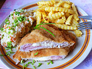 Dzisiaj u nas frytki, kotlet cordon bleu, surówka colesław, do picia herbata z cytryną, woda z sokiem malinowym i sok z czarnej porzeczki.