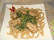 Makaron pełnoziarnisty, szpinak serowy i pierś z indyka