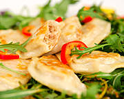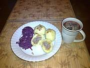 Wczorajsza zupa ogórkowa, pierogi z kapustą i grzybami. Do picia to co zwykle+ sok winogronowy.