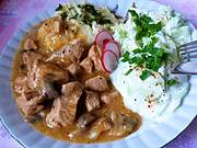 Czwartek: gulasz, kasza jęczmienna lub gryczana lub ziemniaki i surówka z ogórków kiszonych oraz kompot z śliwek węgierek