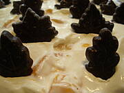 Na serniku to kleksy z białej polewy,kosteczki skórki pomarańczowej i gotowej posypki waflowej w kolorze pomarańczowym.