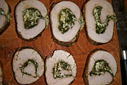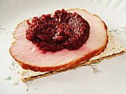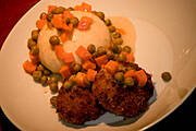 Poświąteczna rolada z piersi z indyka ze szpinakiem i serem pleśniowym pokrojona na plastry, które zostały zanurzone w gęstym cieście naleśnikowym i usmażone, beszamel chrzanowy barwiony czerwonym wytrawnym winem, sałatka z ogórków konserwowych, cebuli i kaparów.