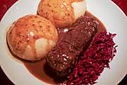 Łopatka duszona w plastrach w sosie własnym, kluski na parze i mizeria.