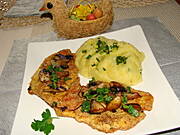 Dosyć już knajpowego i proszonego-poświątecznego jedzonka, zatęskniłam za zwyczajnym, domowym; pierś drobiowa, natarta sokiem z cytryny i masłem ziołowo-czosnkowym, oprószona kaszą kukurydzianą, z pieczarką i z ziemniakami ze szczypiorkiem.